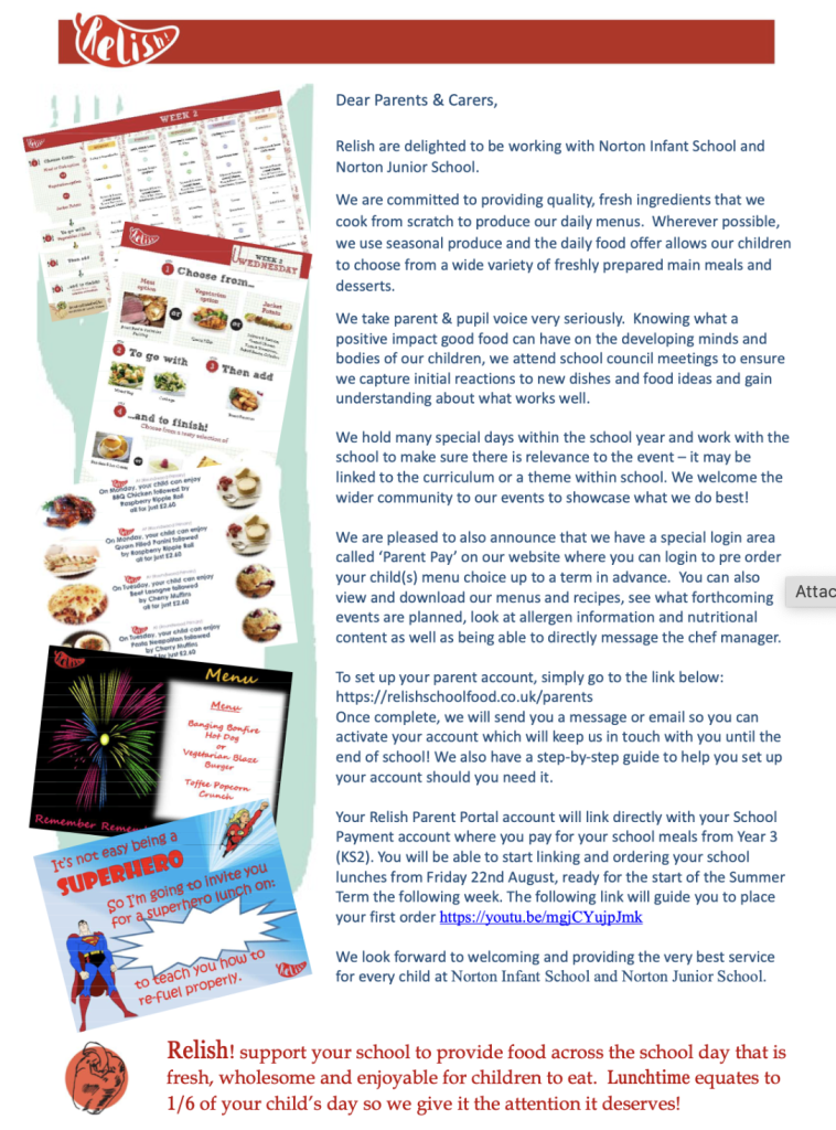 From Monday 2nd June 2025, our school meals will be provided by Relish. Please find further details by visiting this link. https://relishschoolfood.co.uk/index.php